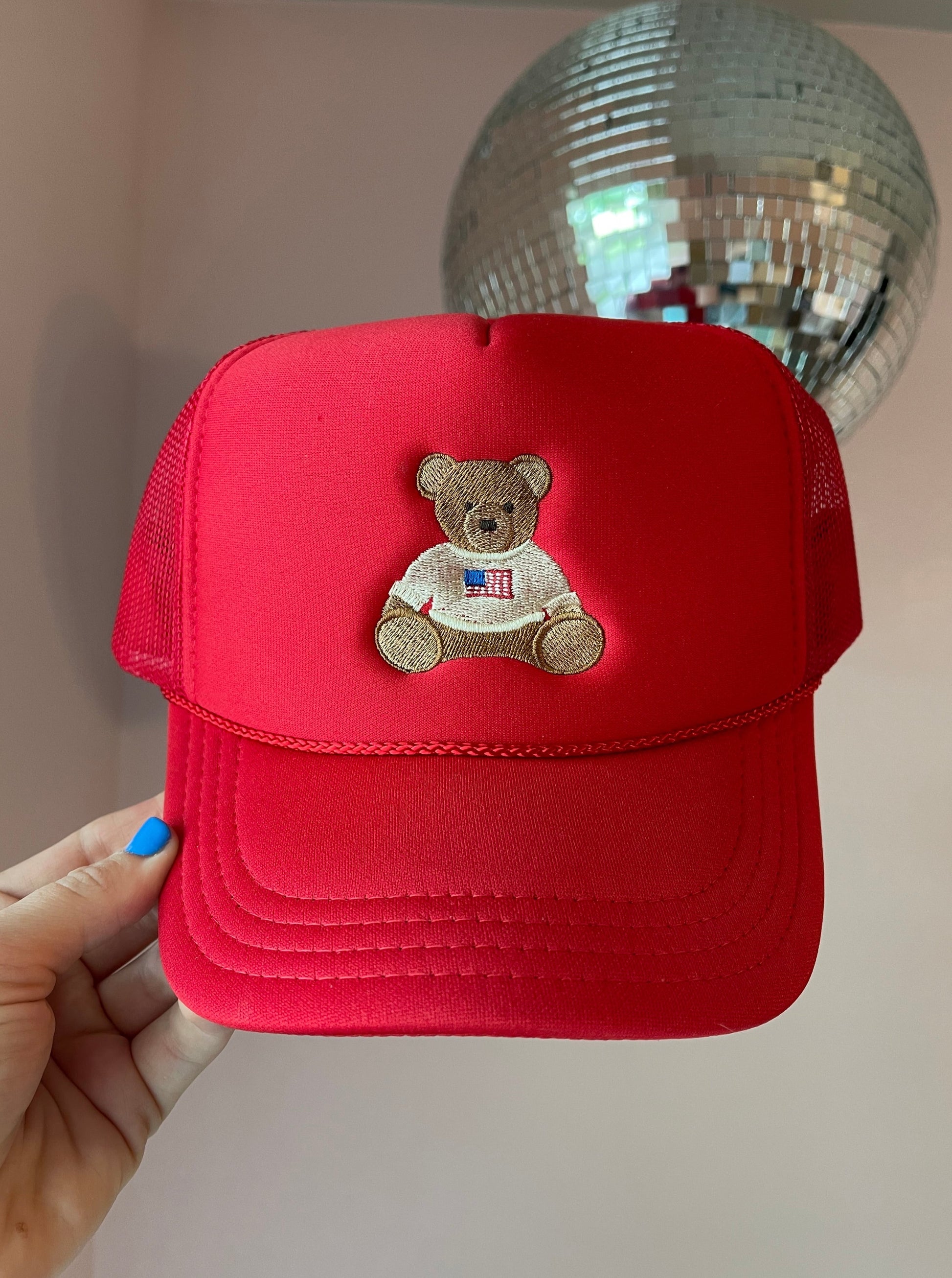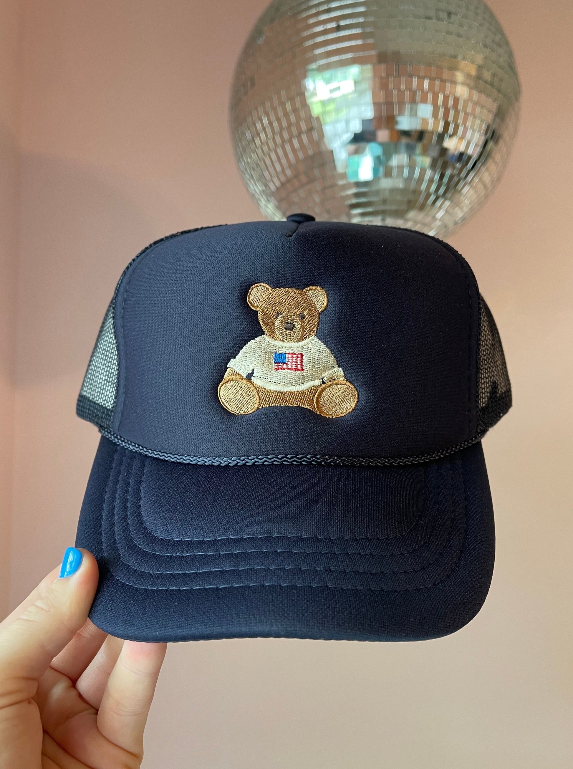 Check out our fun kids trucker hat featuring an embroidered teddy bear in an American flag sweater!