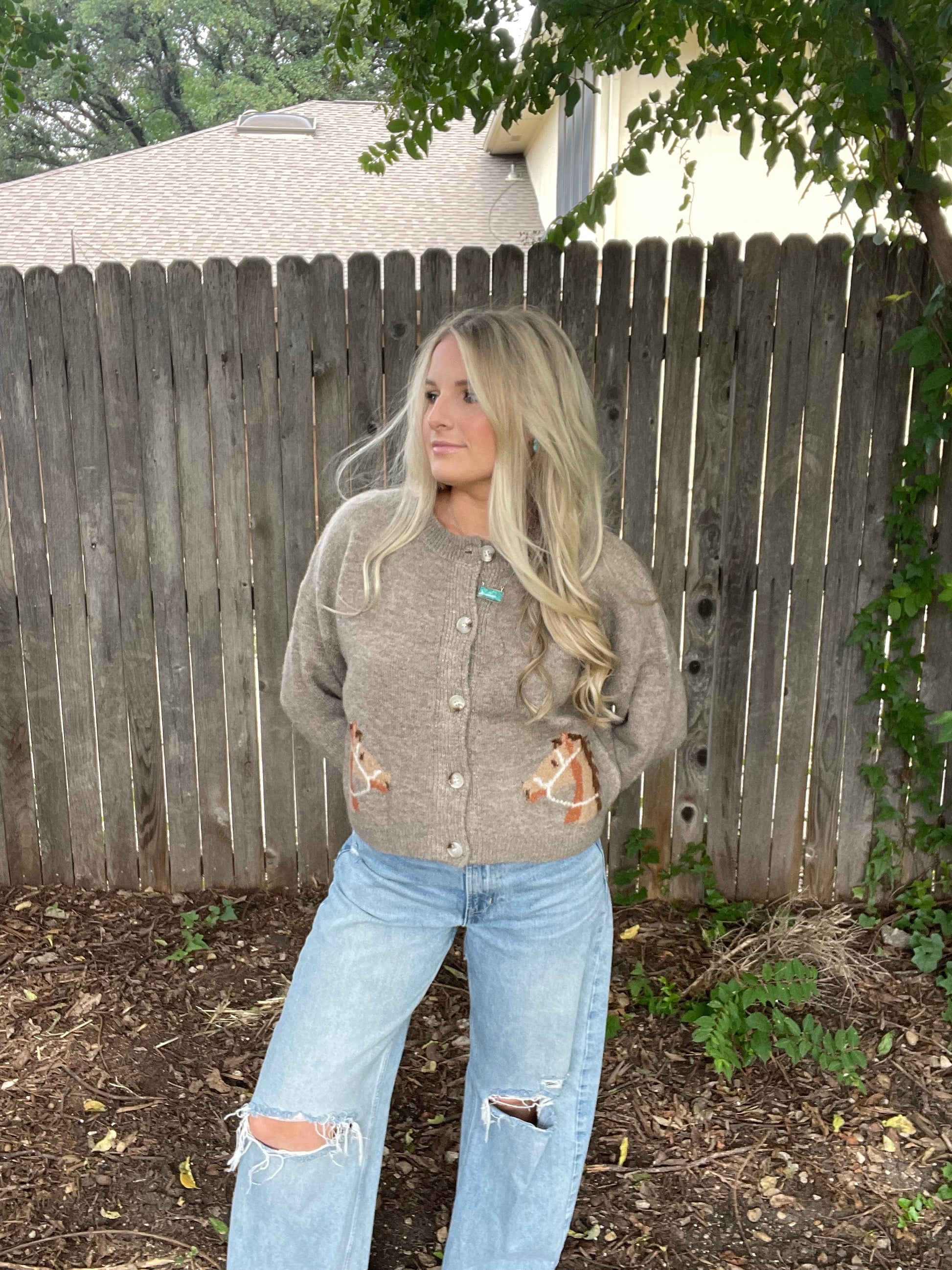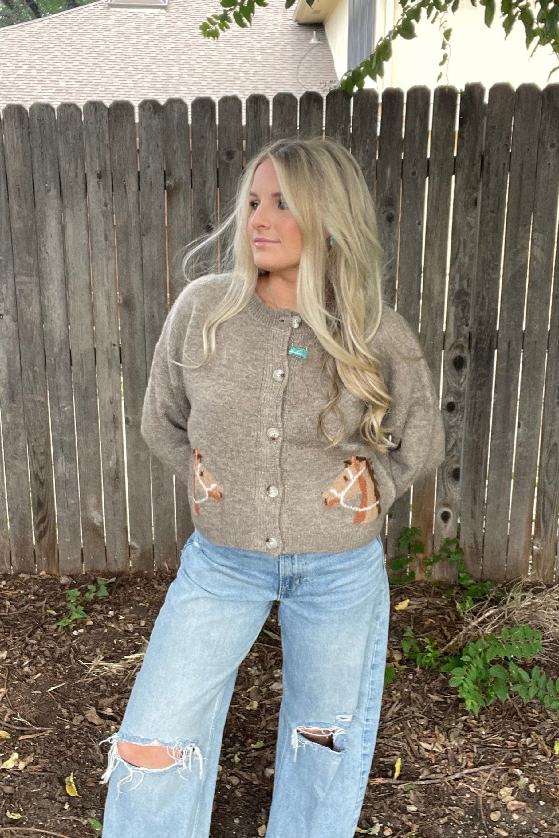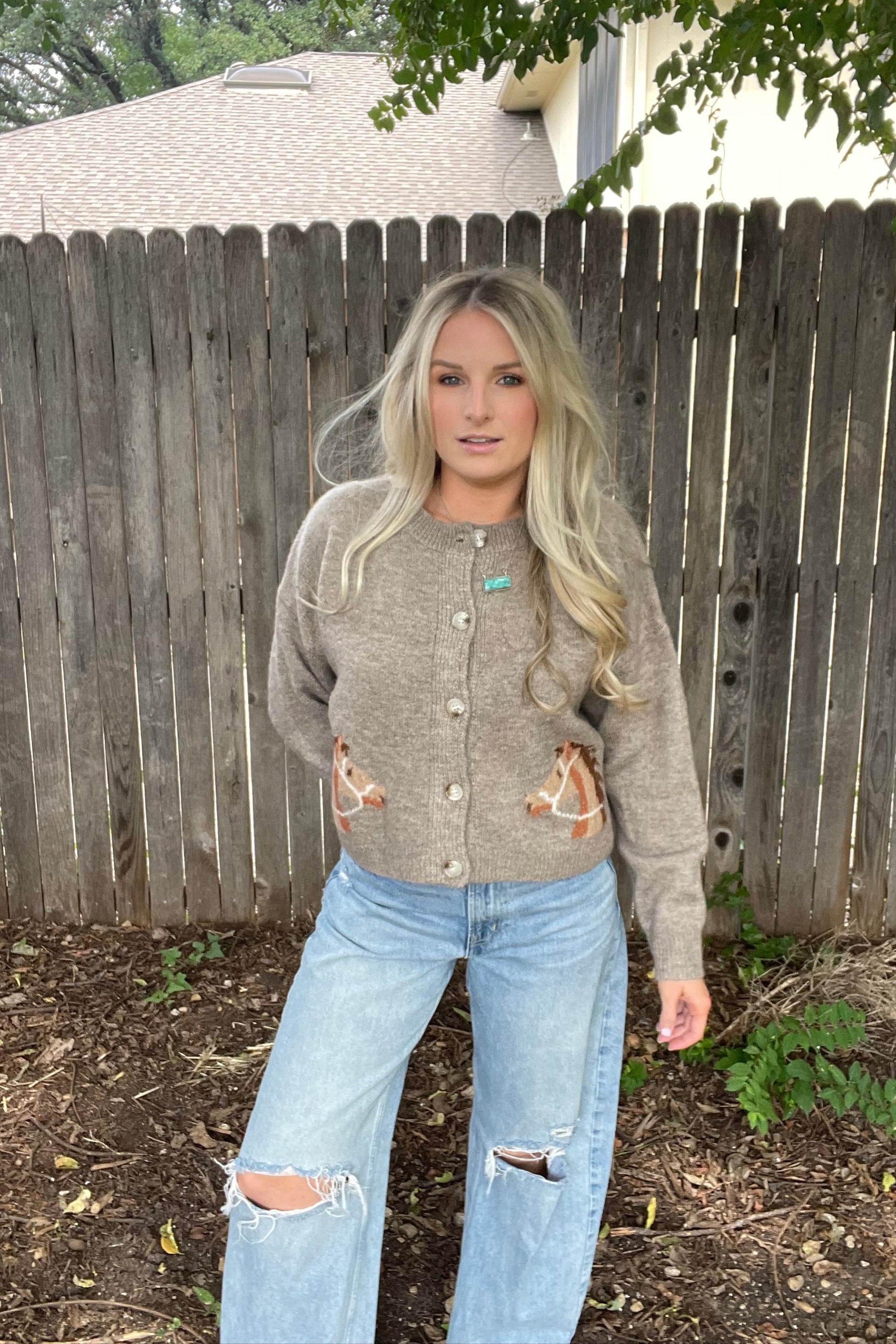 Make a statement in this charming chocolate brown cardigan featuring a playful horse graphic and classic ribbed trim detailing. The crew neckline and button-front design create a versatile silhouette perfect for western-inspired layering. The premium blend ensures cozy comfort while maintaining shape.