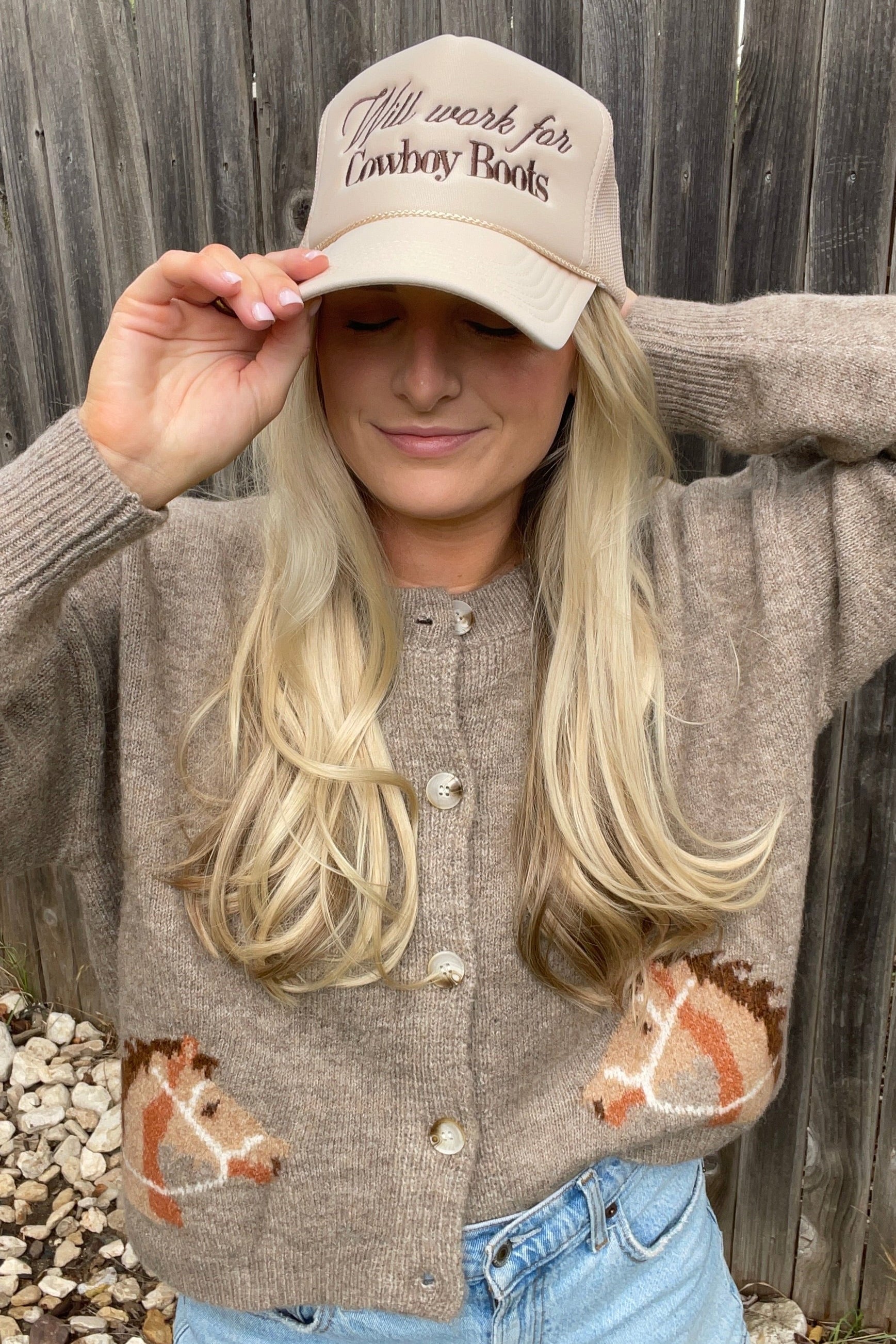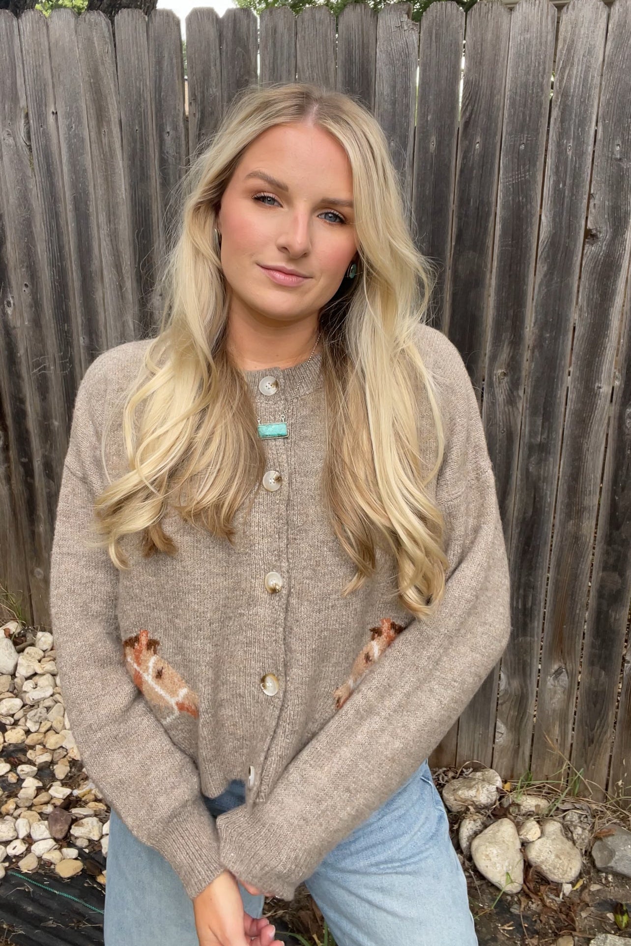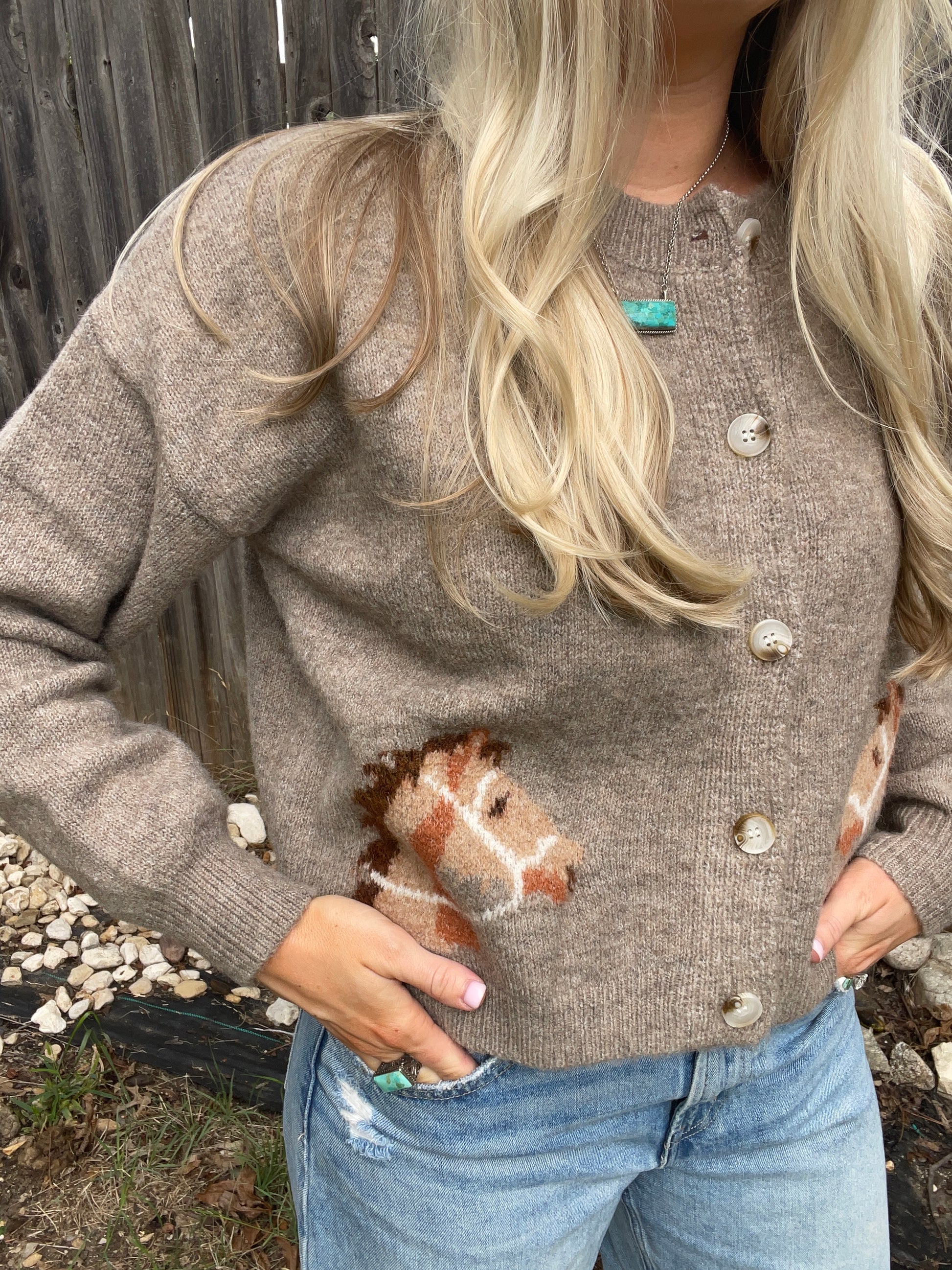 Make a statement in this charming chocolate brown cardigan featuring a playful horse graphic and classic ribbed trim detailing. The crew neckline and button-front design create a versatile silhouette perfect for western-inspired layering. The premium blend ensures cozy comfort while maintaining shape.