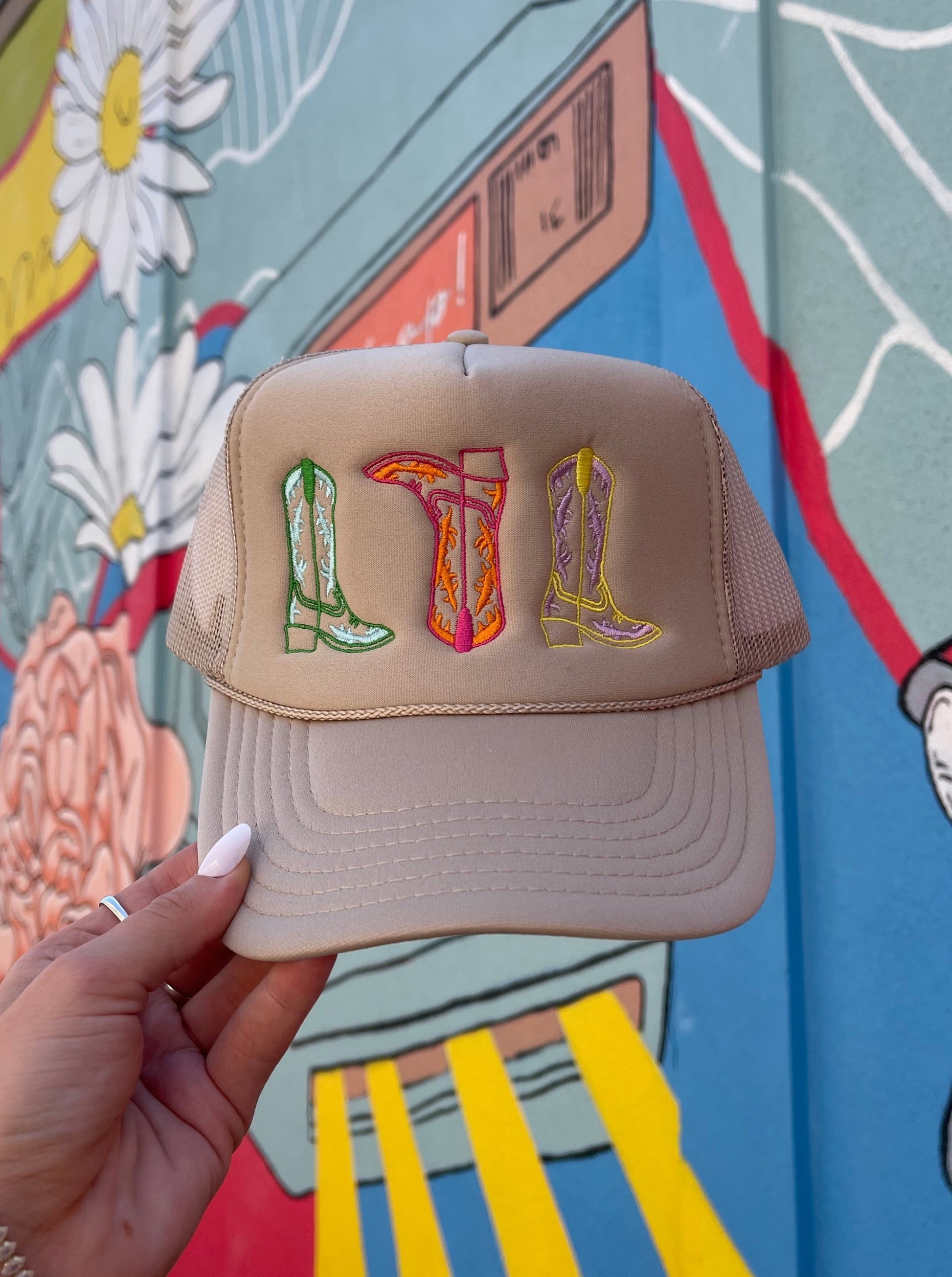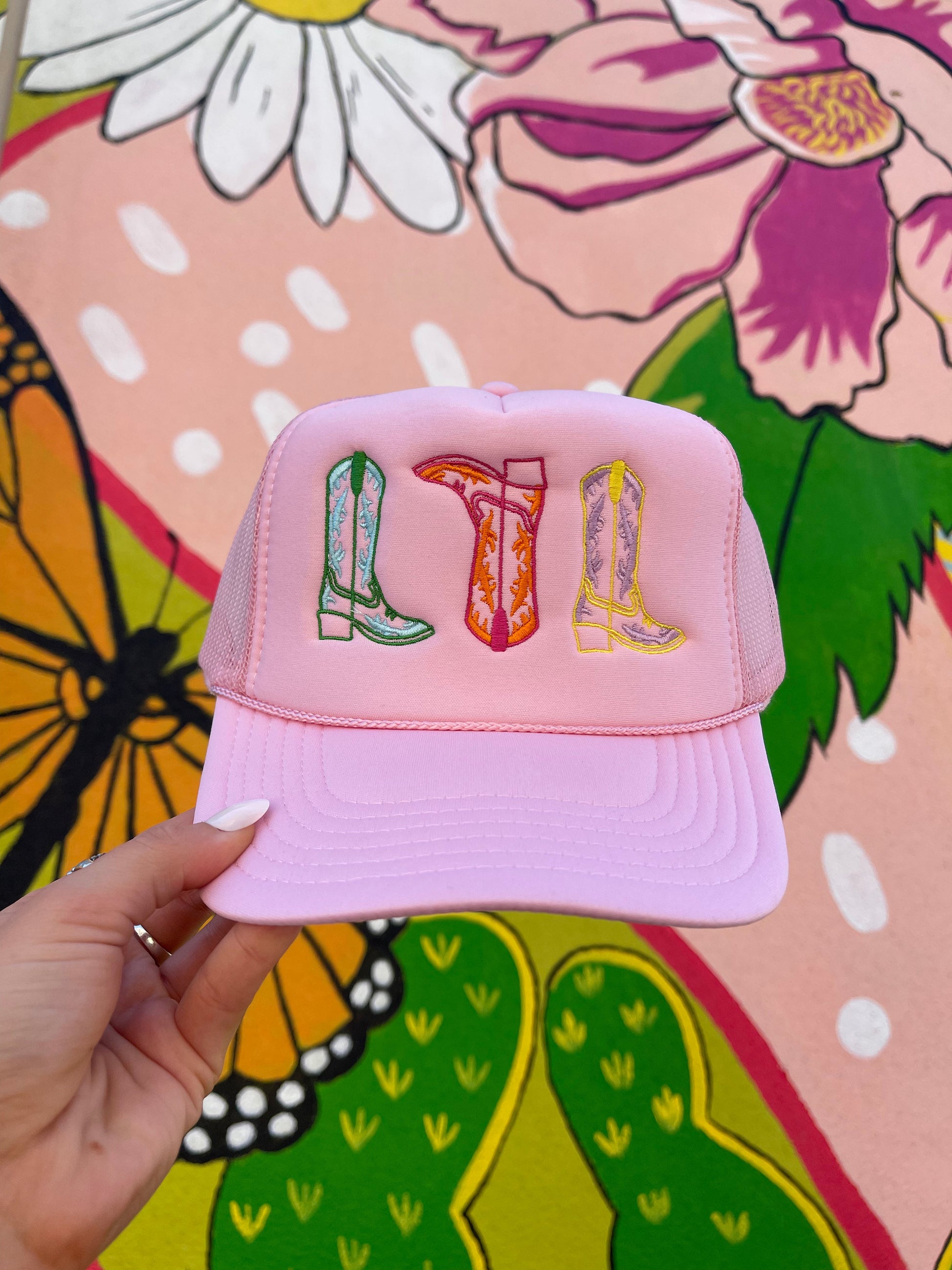 Iconic trucker hat with 3 embroidered multi-colored cowboy boots now in kids size!