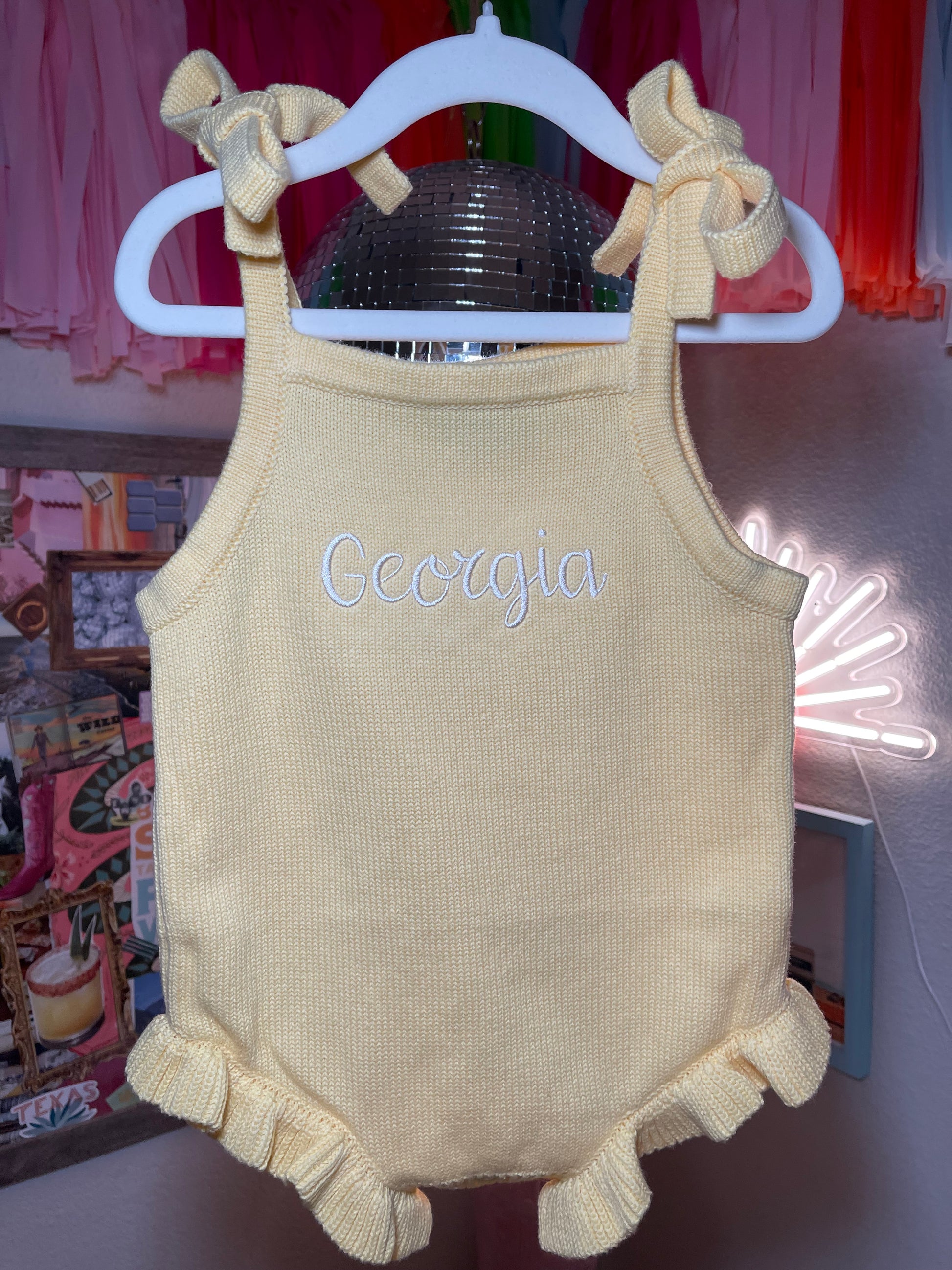 Custom Embroidered Baby Sunsuit – Knit with Ruffles & Bows
