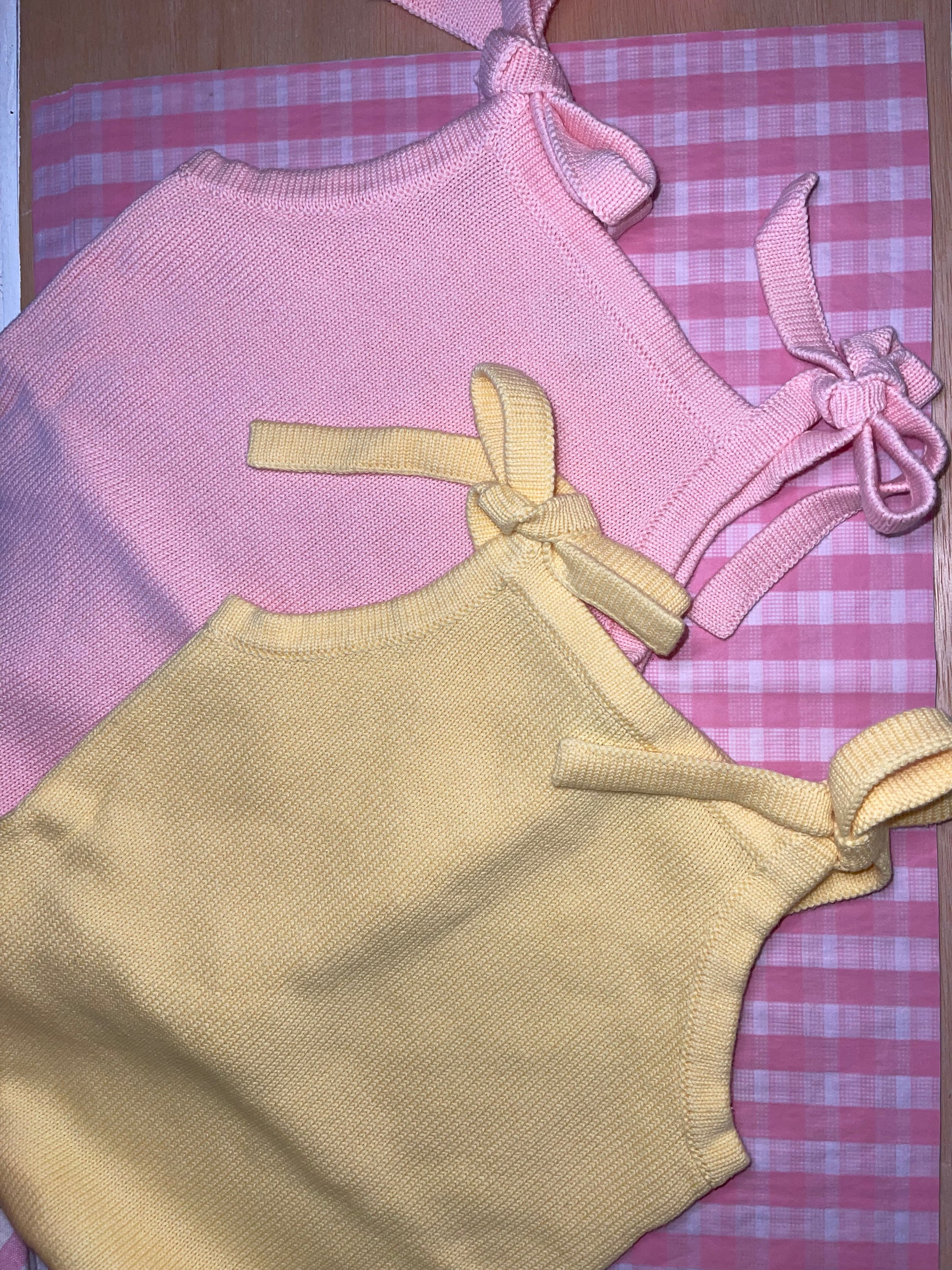 Soft, sweet, and sunshine-ready ☀️ These knit baby sunsuits feature adorable ruffle leg details and adjustable shoulder ties that can be tied into the perfect little bows. Available in blush pink and sunshine yellow, they’re ideal for warm days, playtime, and photo-worthy moments. Add custom embroidery to make it extra special!