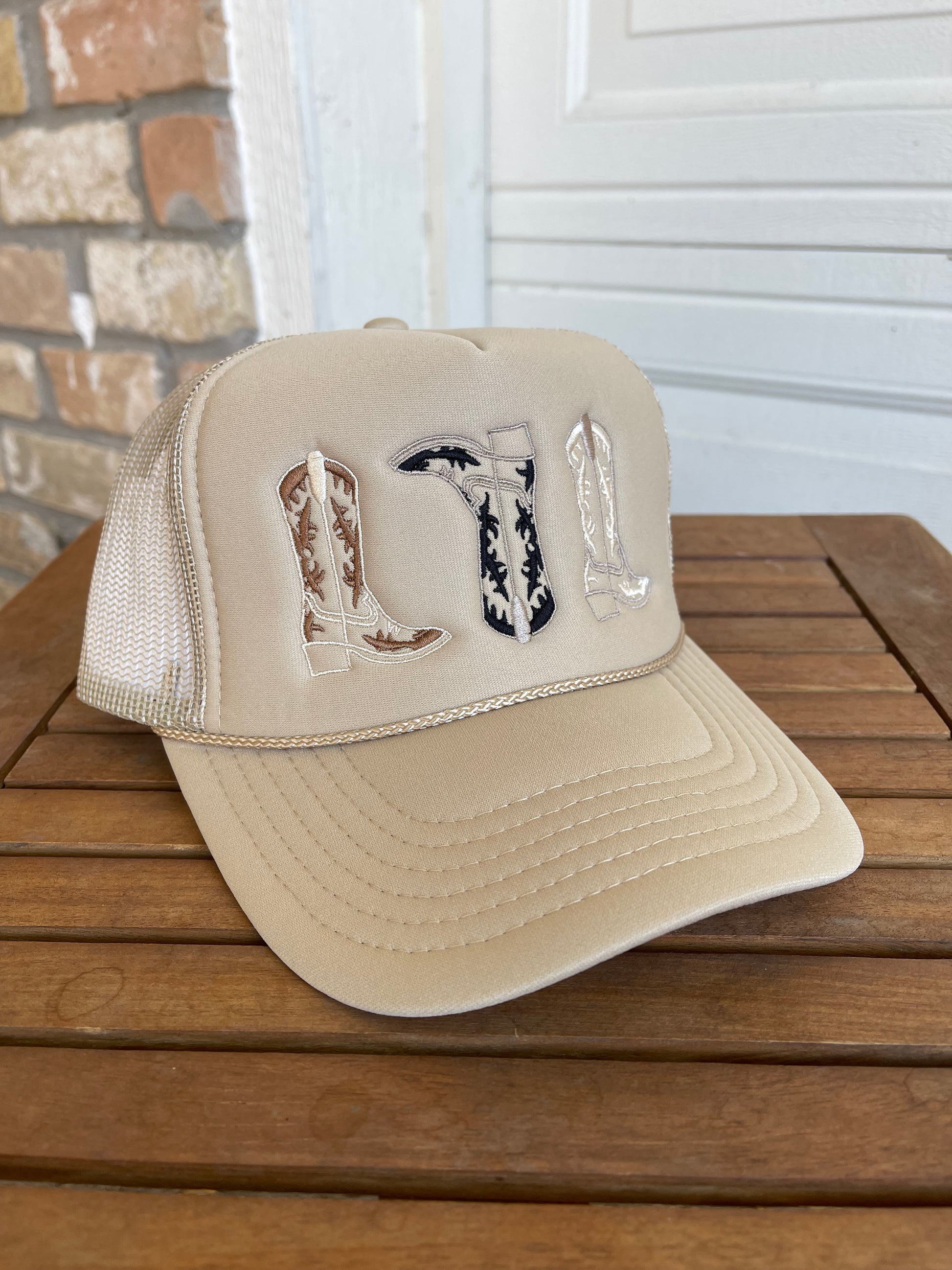 Tan trucker hat with 3 embroidered cowboy boots in the perfect neutral fall colors