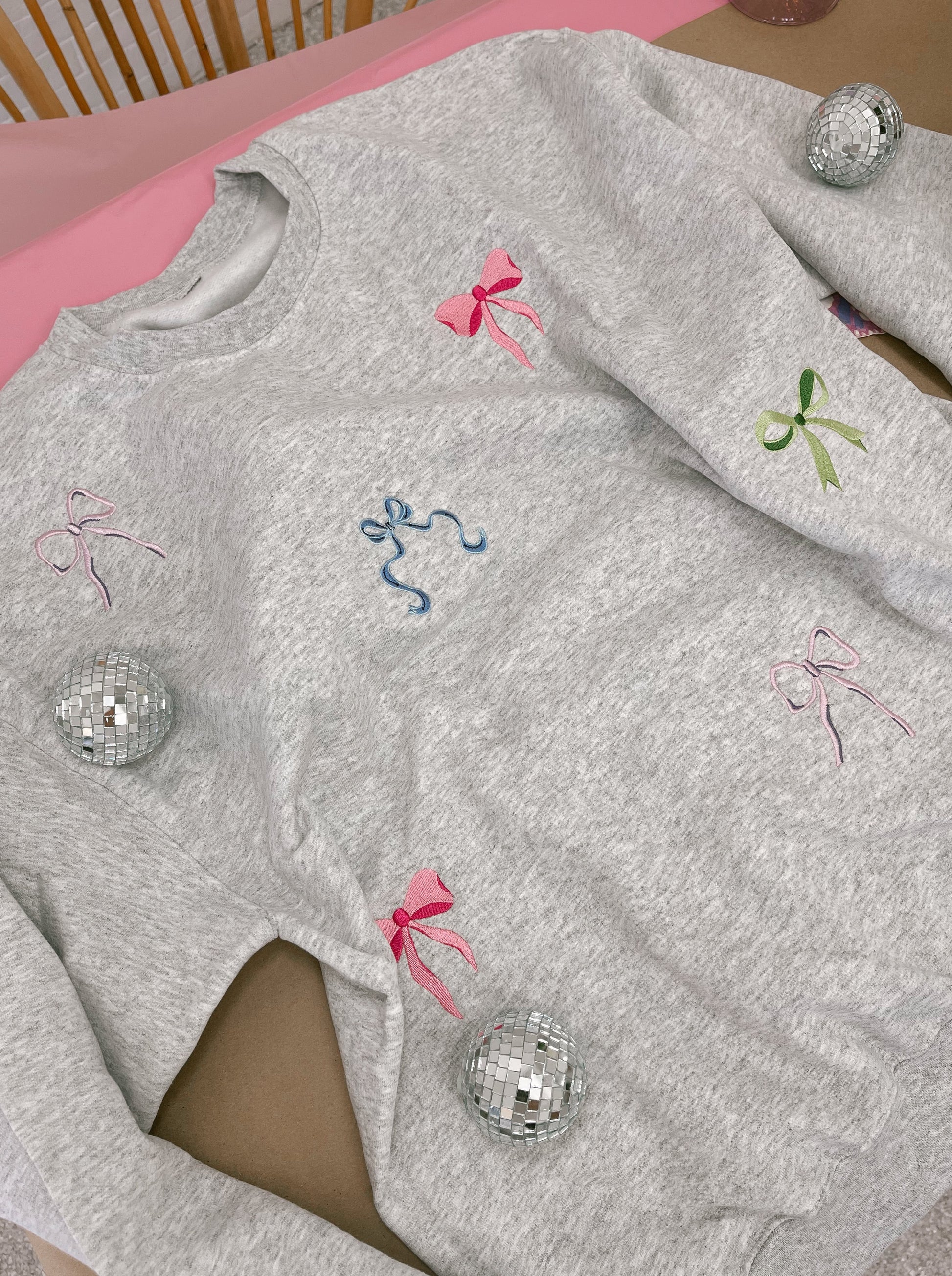 This crewneck includes a combination of all of our signature embroidered bows.