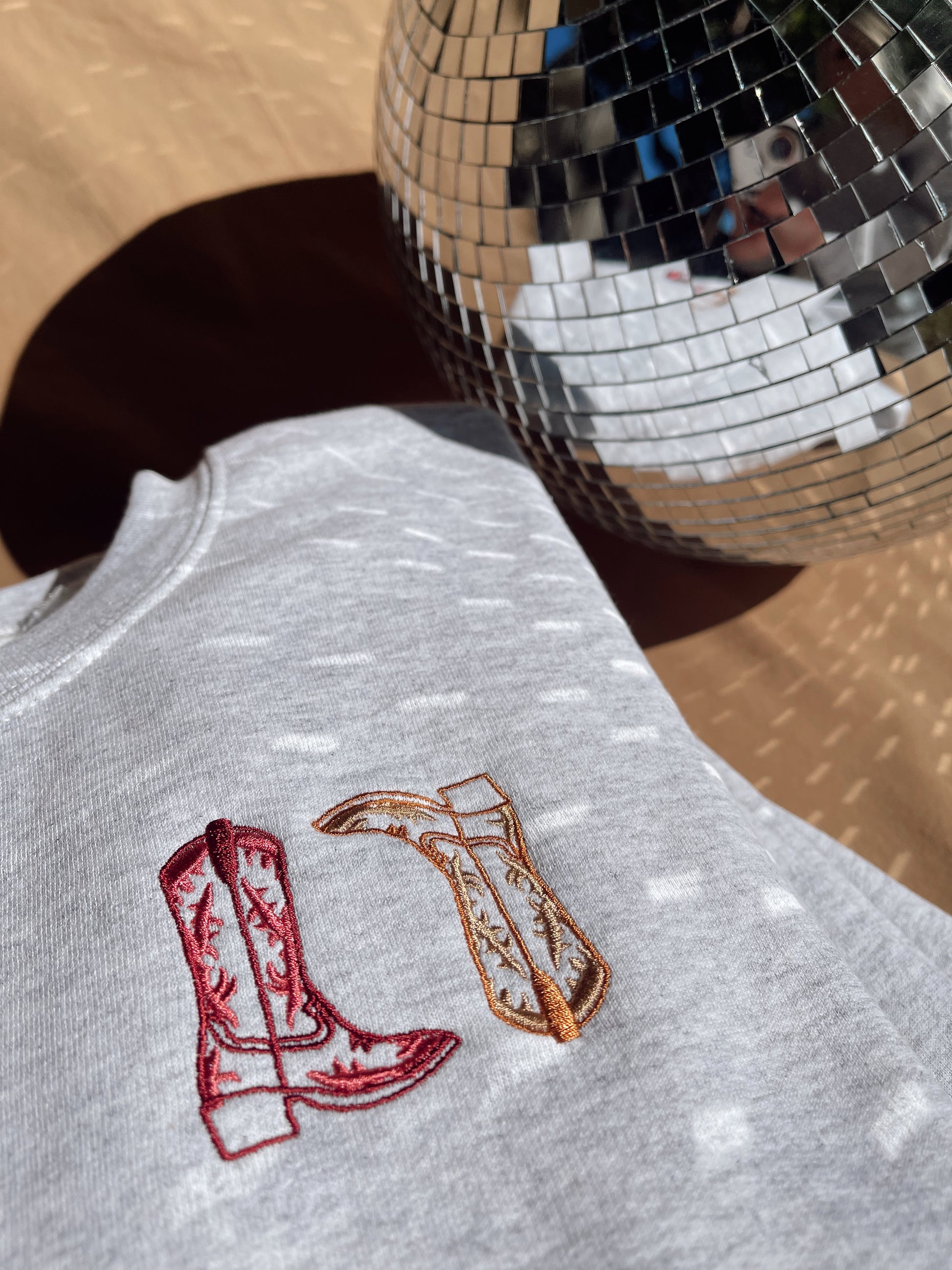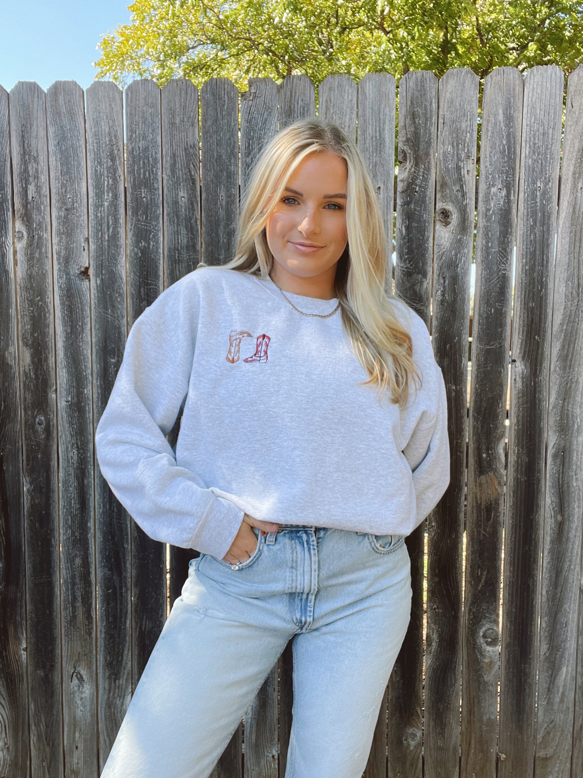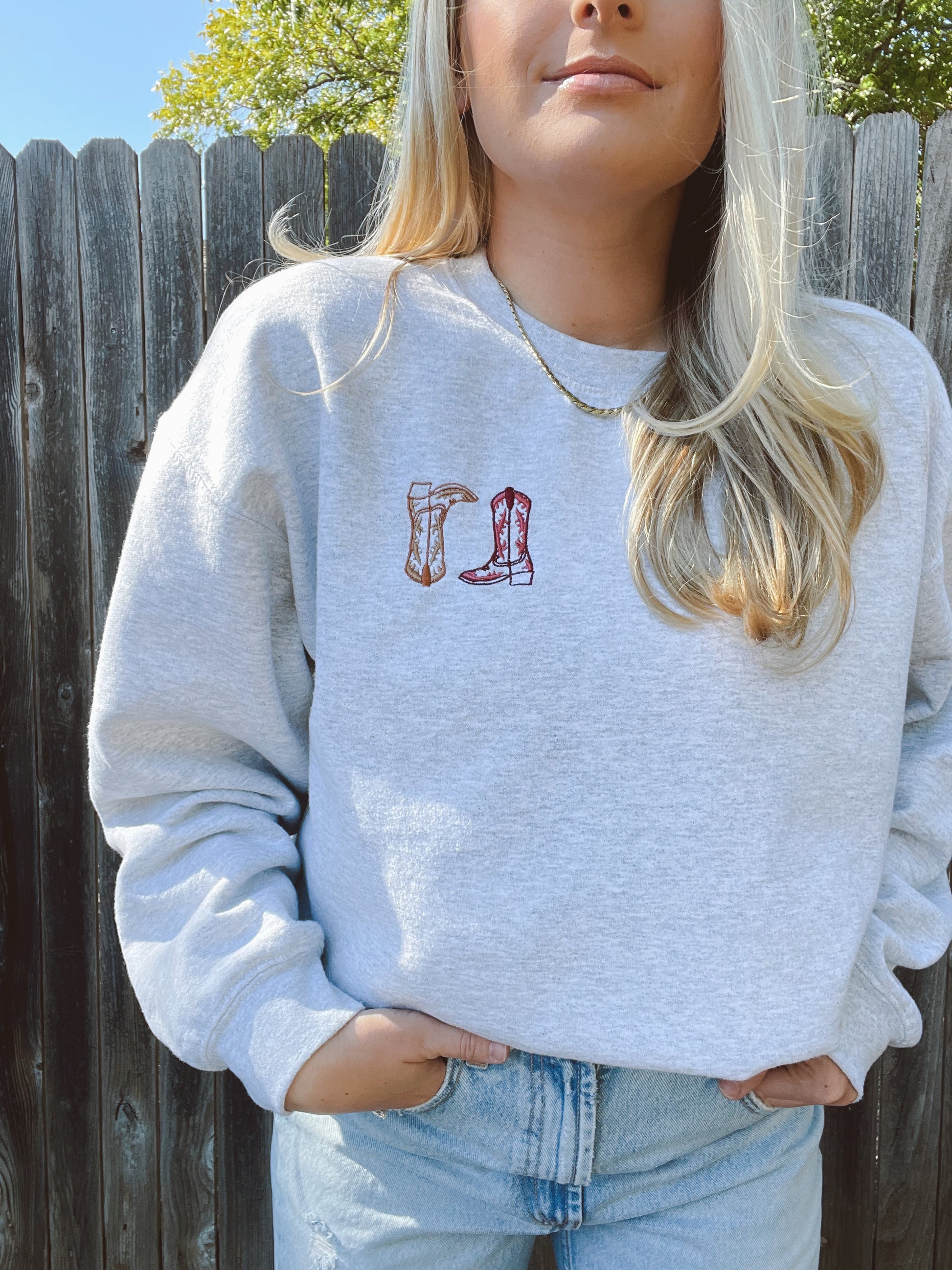 Stay warm and cozy with this Out West crewneck sweatshirt featuring our signature embroidered cowboy boots.