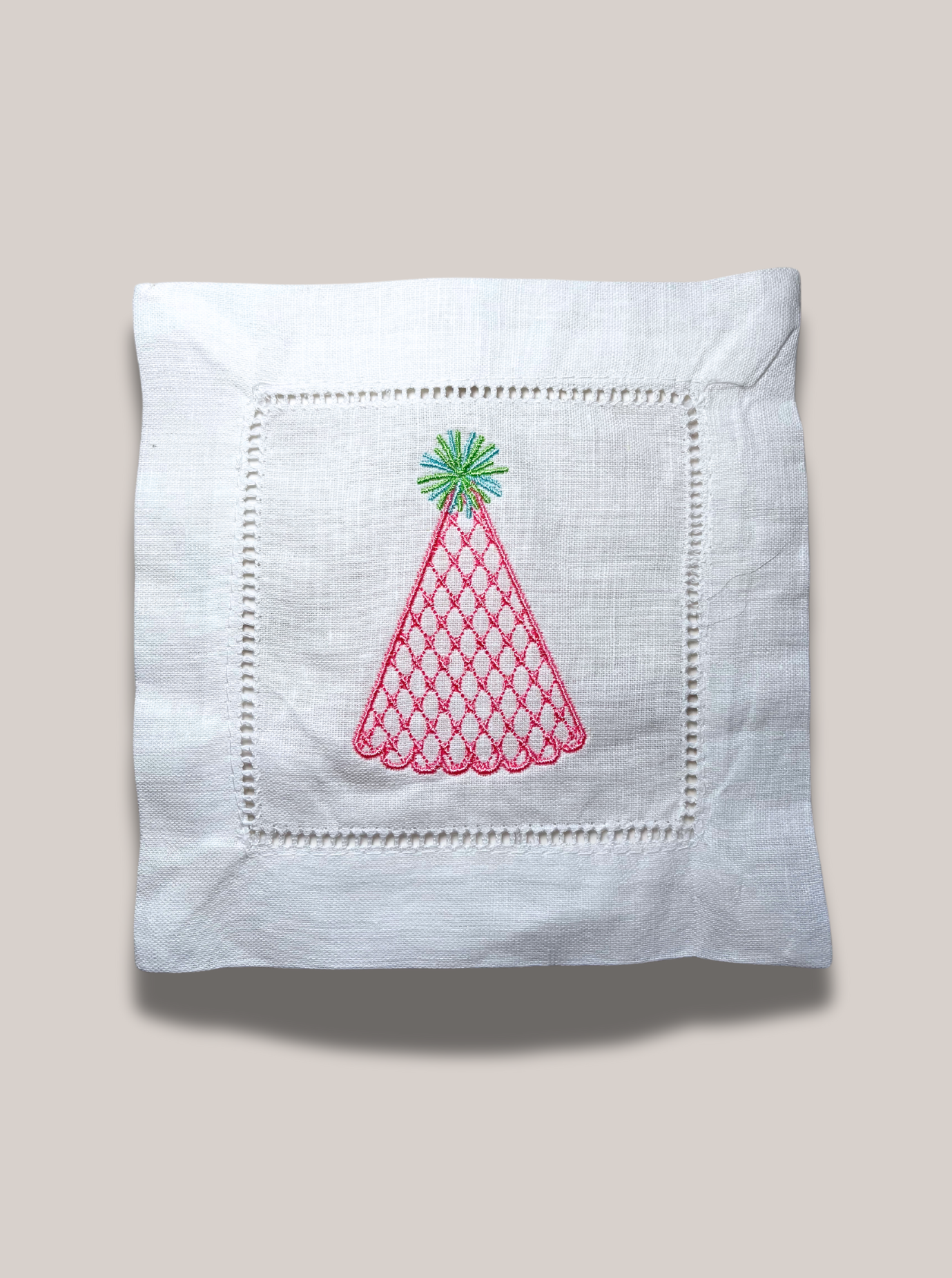 Celebrate in style with our Party Hat Embroidered Linen Cocktail Napkin! Made with fine linen, this napkin features a charming embroidered party hat design. Perfect for adding a festive touch to your next birthday party.