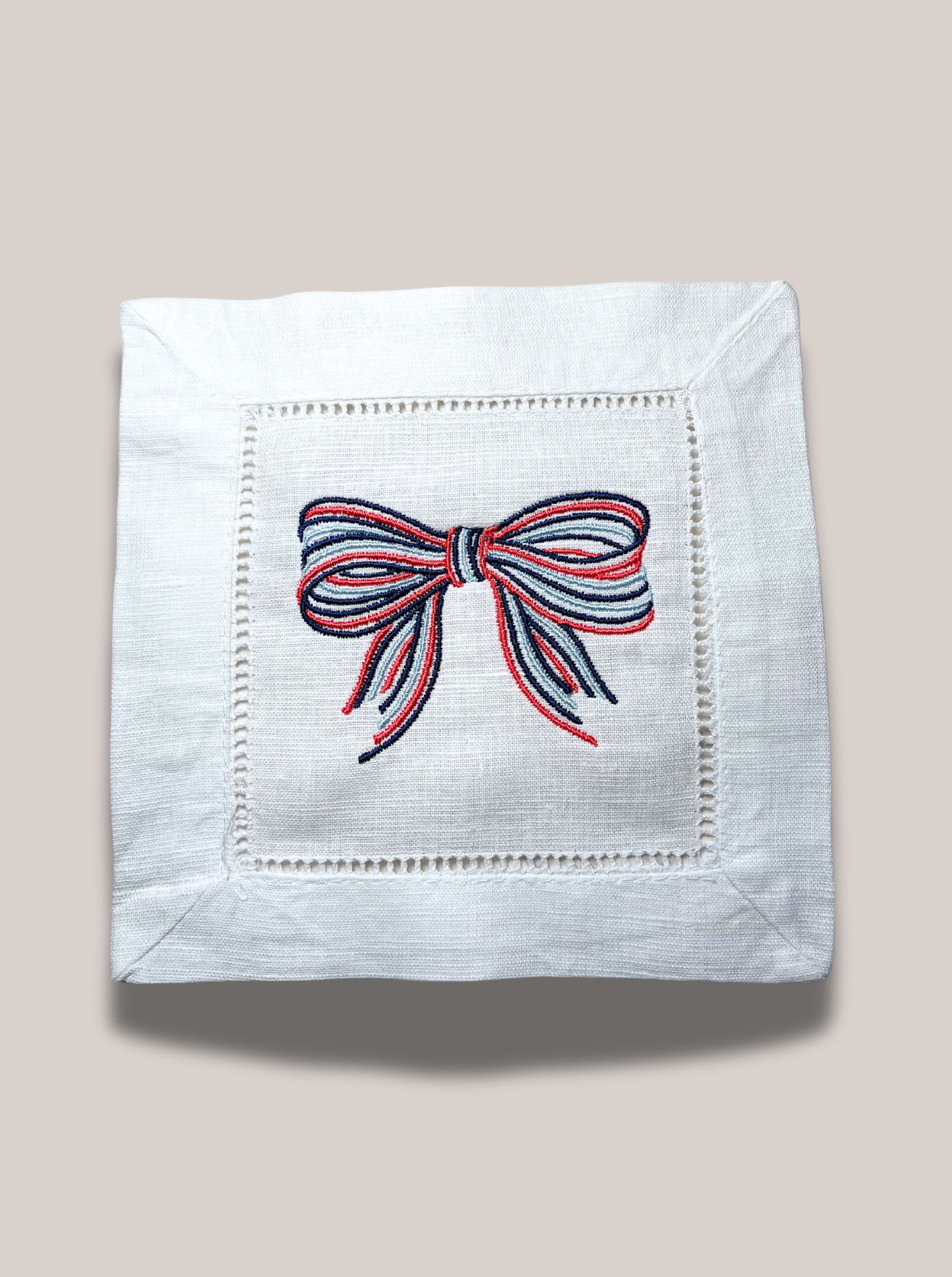 Add a touch of patriotic flair with our Patriotic Bow Linen Cocktail Napkin! Featuring a red and blue embroidered bow, this napkin is perfect for any celebration. Made of high quality linen, it adds a subtle yet fun element to your tablescape.
