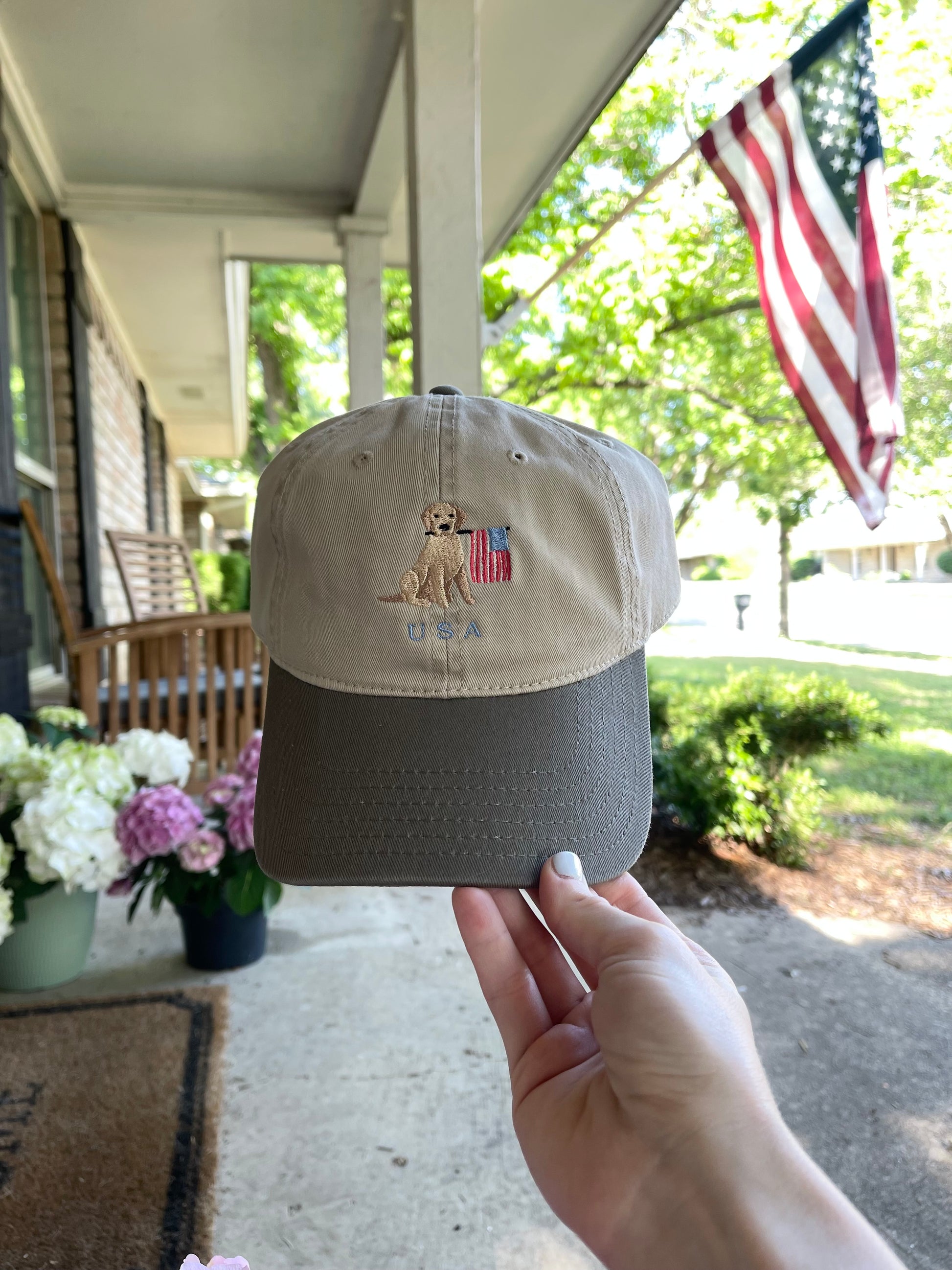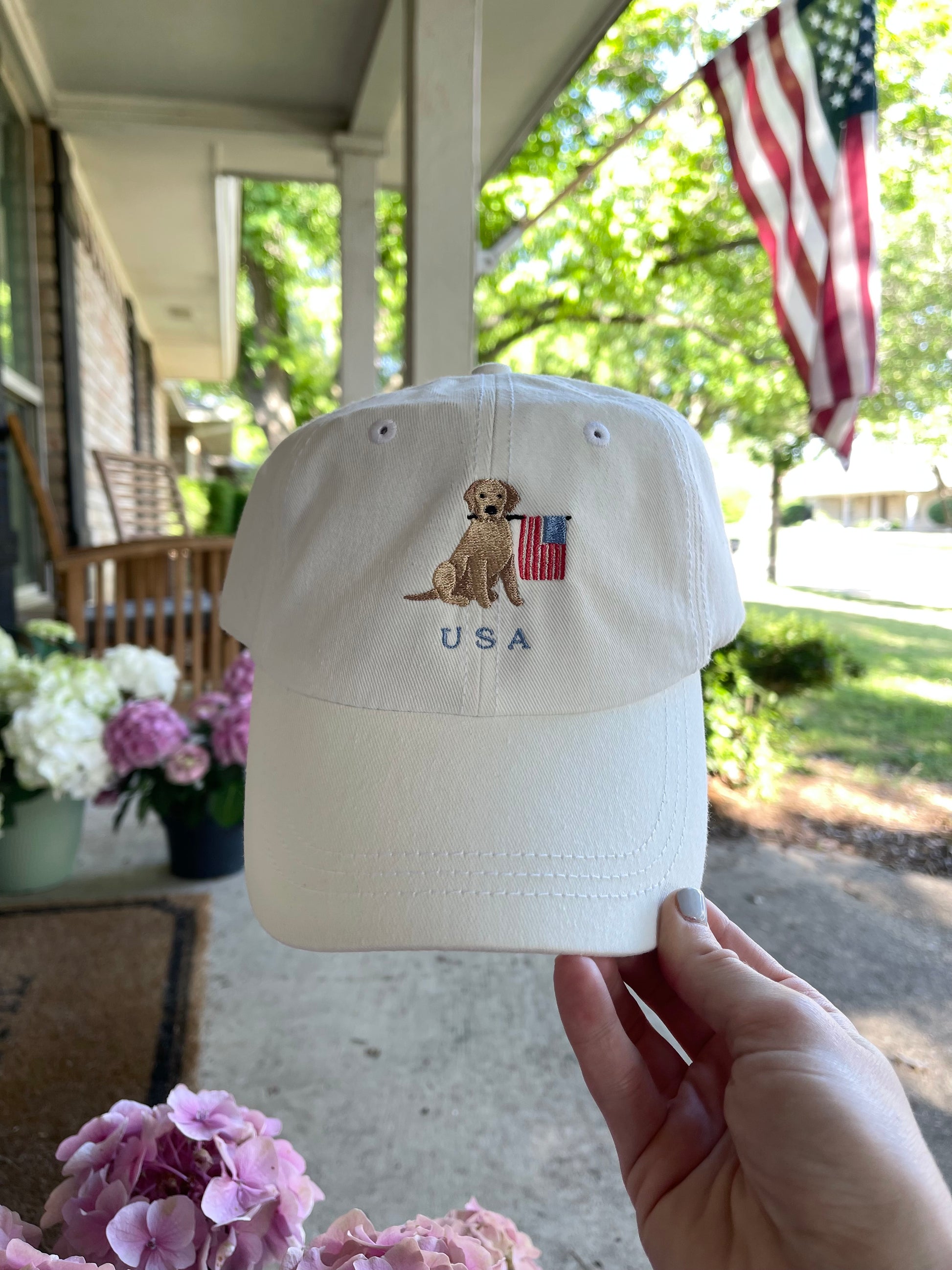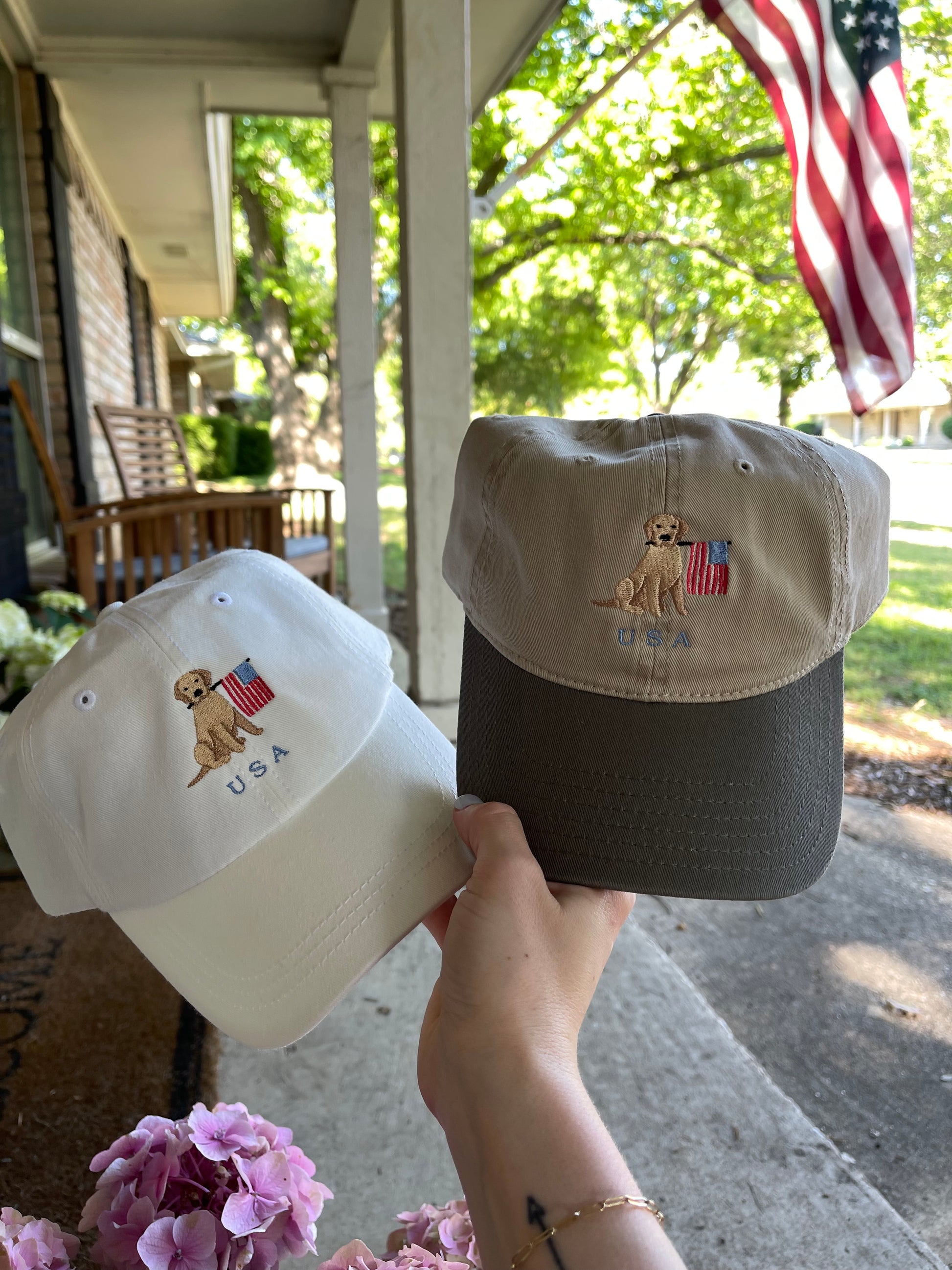 Celebrate summer in style with our Patriotic Puppy Hat, the perfect accessory for Memorial Day, the 4th of July, and all your summer adventures. Featuring a charming embroidered golden retriever puppy proudly holding an American flag, with “USA” stitched beneath, this hat brings together timeless Americana and playful charm.