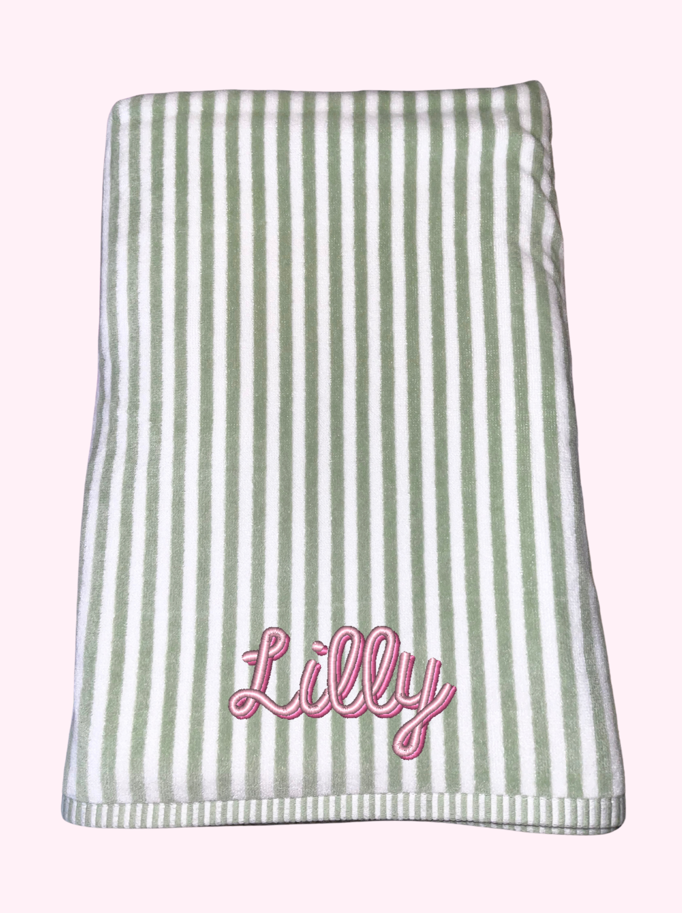 Customize your perfect beach towel! Green striped towel with striped edges. Makes a great gift for birthdays, spring break or summer vacation!