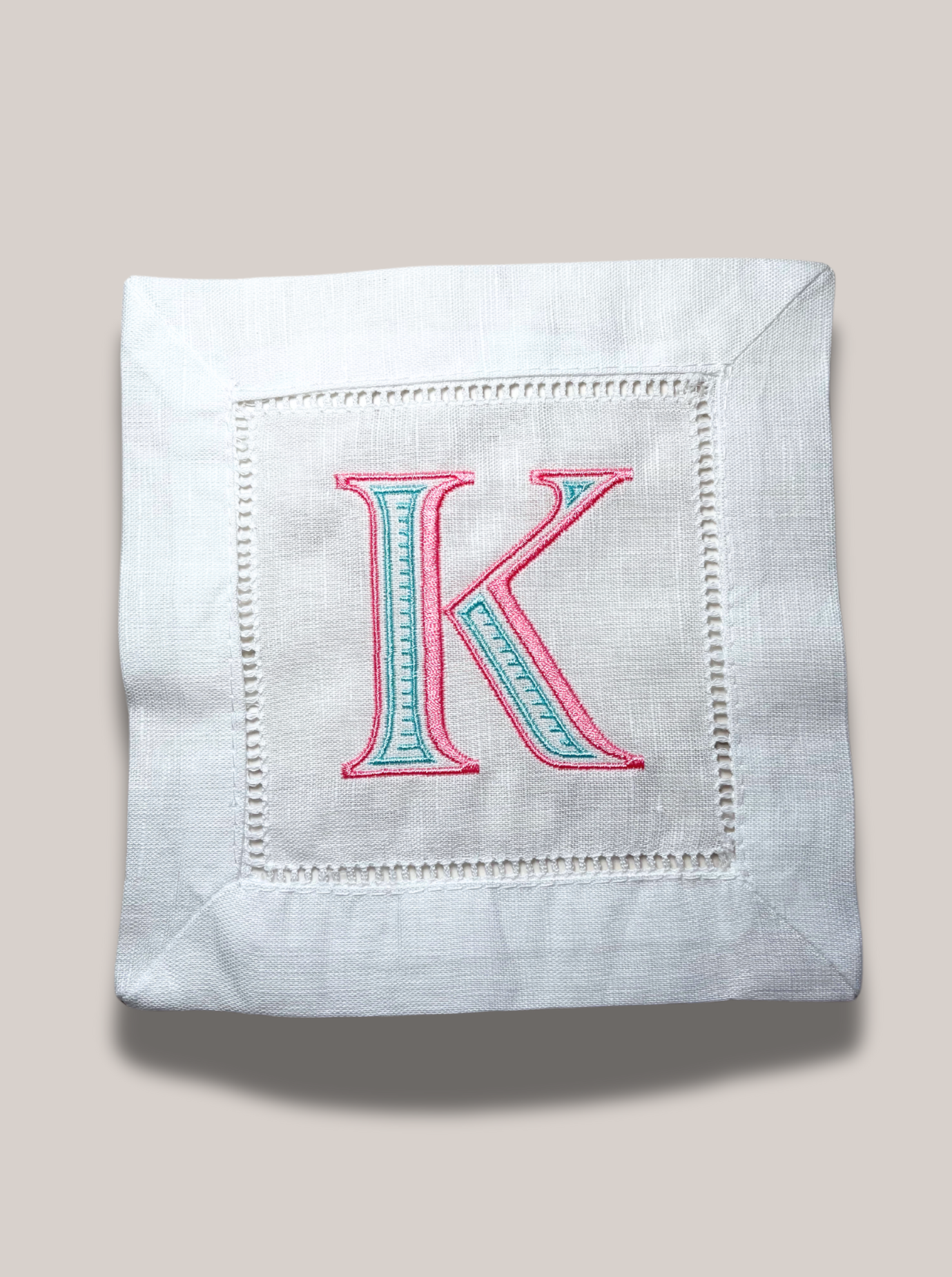 Add a personalized touch to your next cocktail party with our Pink & Blue Initial Linen Cocktail Napkins. Featuring delicate pink and blue embroidery, these napkins are a fun and unique addition to any gathering. Perfect for adding a pop of color and style to your drink station.
