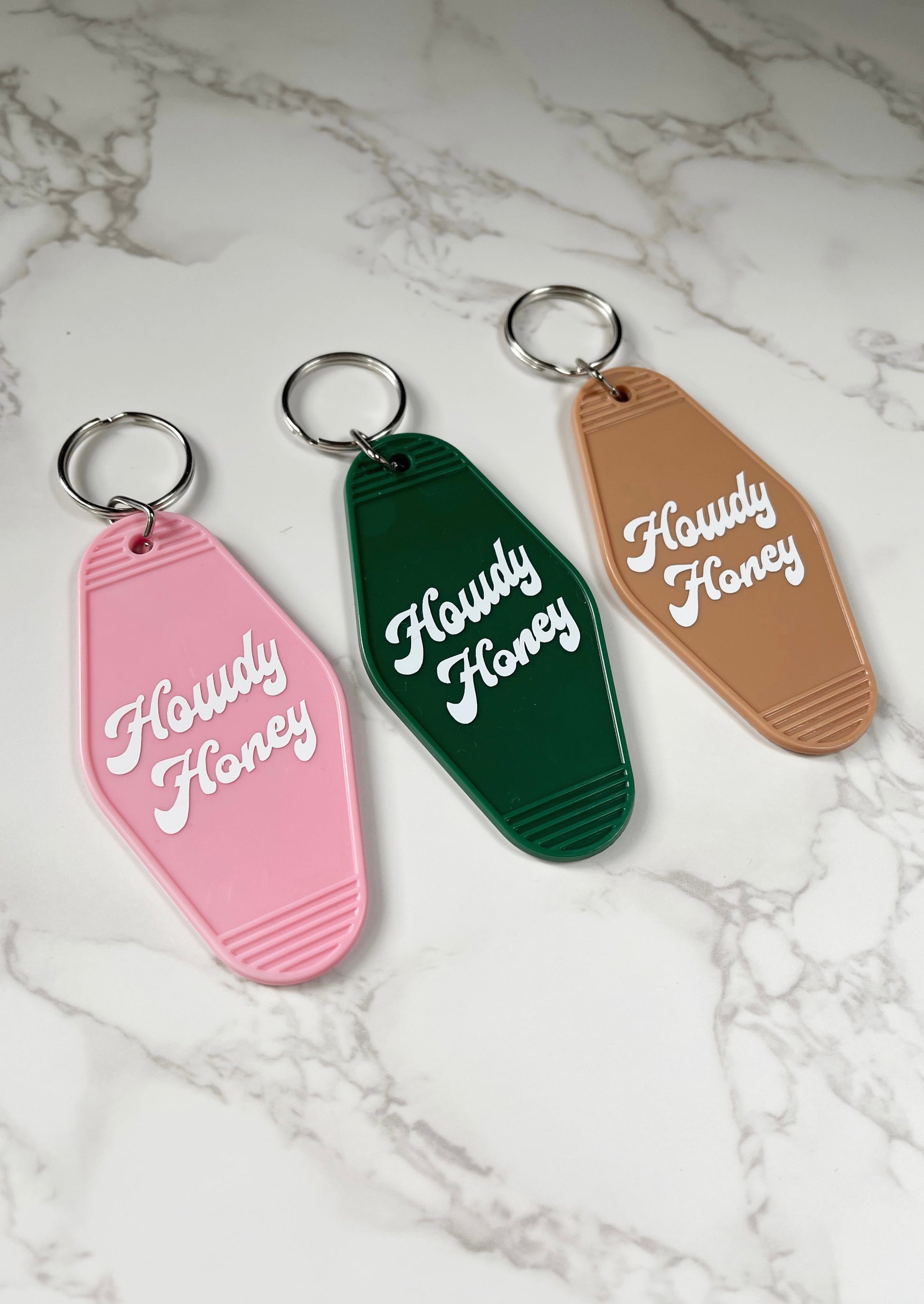 Unlock a touch of nostalgia with our "Howdy Honey" retro motel keychains. These charming accessories effortlessly blend vintage vibes with a Western twist. With their bold design and timeless appeal, they're sure to catch eyes and start conversations. Grab a "Howdy Honey" keychain and make a statement that's both nostalgic and effortlessly cool.